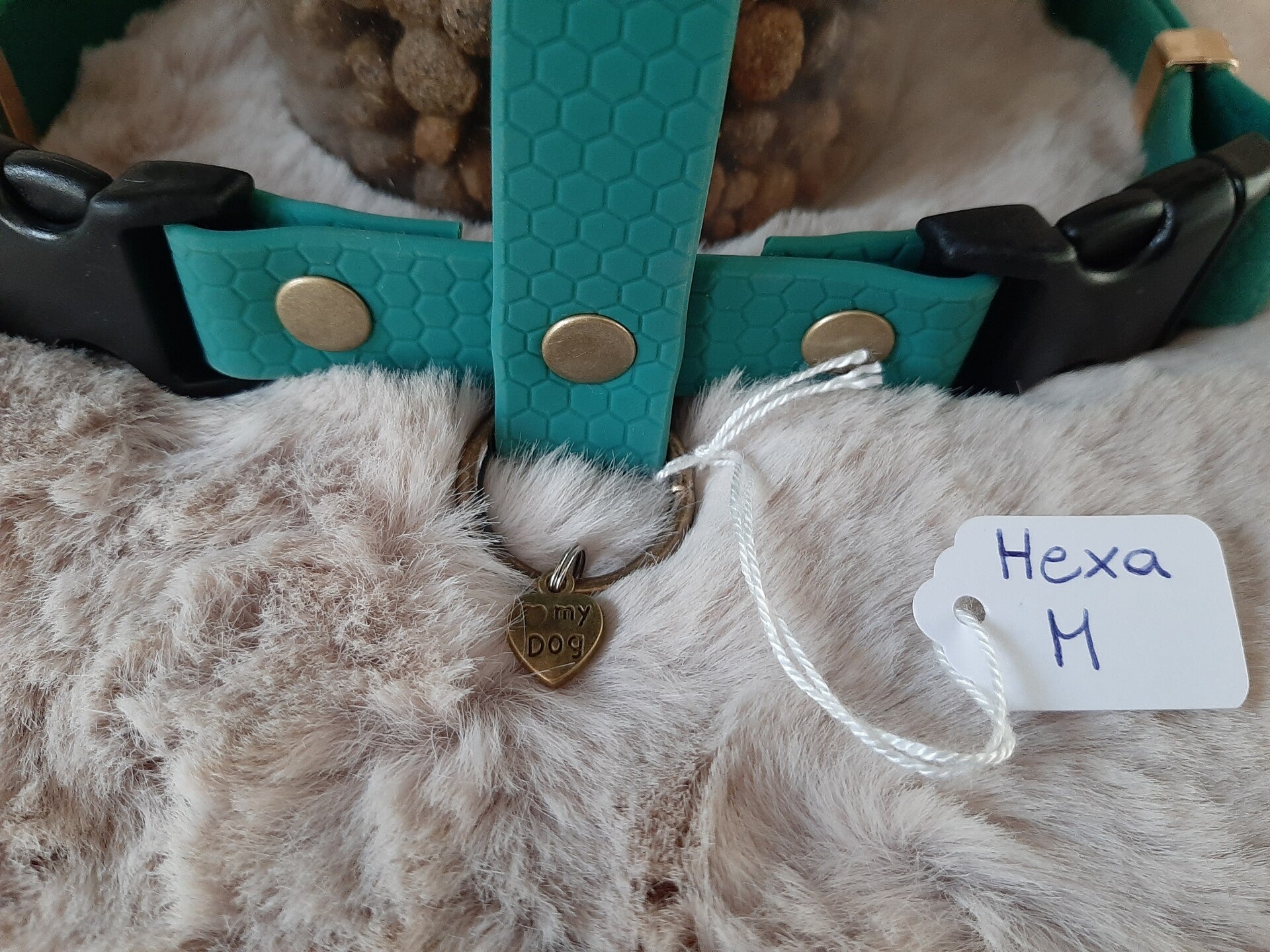 Hexa Biothane Brustgeschirr mit Antikmessing Beschlägen und 2 Kunststoffschnallen am Bauchgurt, sowie stufenlos verstellbar. Leicht zu reinigen.